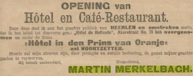 Op 25 april 1896 verschenen in de Limburger Koerier twee advertenties van Martin Merkelbach. ‘Door deze deel ik het geachte publiek van Heerlen en omstreken mede dat ik het hôtel tot dusverre gen.: ,,Hôtel de Hollande”, Akerstraat No. 71 heb overgenomen en onder de firma >> Hôtel in den Prins van Oranje << zal voortzetten’. Vervolgens prees Tien Merkelbach, zoals hij bekend zou worden, zijn nieuwe zaak aan door de kwaliteiten te benoemen, zoals het Duitse bier, de fijne wijnen, de prachtige zomertuin en de prompte bediening.